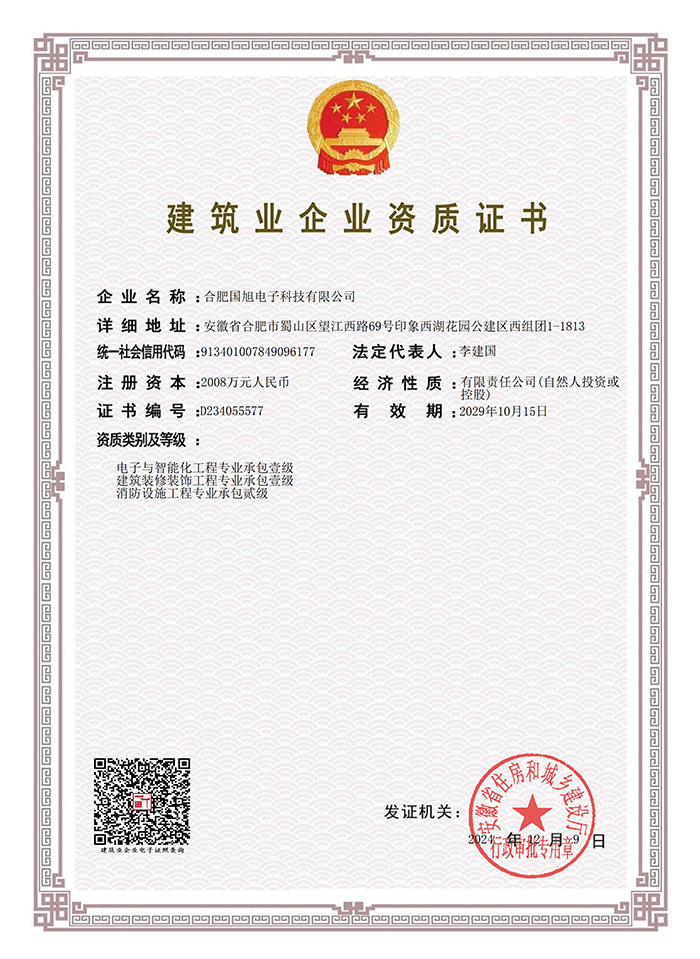公司現(xiàn)已獲得承裝(修、試)電力設(shè)施許可證、電子與智能化工程專業(yè)承包壹級資質(zhì)、建筑裝修裝飾工程專業(yè)承包壹級資質(zhì)、消防設(shè)施工程專業(yè)承包貳級、安全技術(shù)防范行業(yè)壹級資質(zhì)、雷電防護(hù)裝置檢測資質(zhì)證乙級資質(zhì)、安全生產(chǎn)許可證、通過ISO9001:2015質(zhì)量管理體系認(rèn)證、ISO14001:2015環(huán)境管理體系認(rèn)證、OHSAS18001:2007職業(yè)健康安全管理體系認(rèn)證等榮譽(yù)。我們還將進(jìn)一步努力,爭取贏得更多的榮譽(yù)。