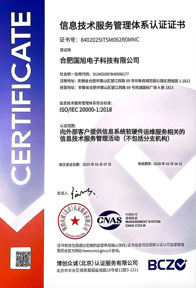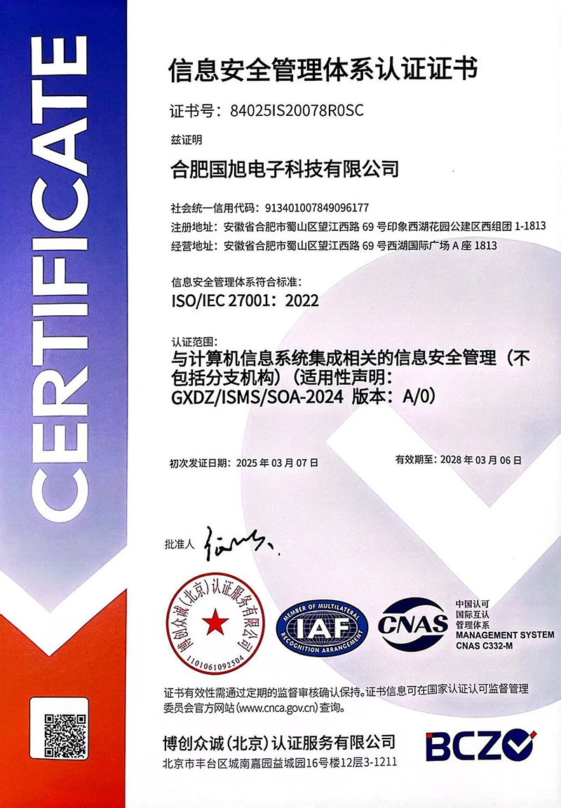 合肥國旭電子科技有限公司創(chuàng)立于2006年,總注冊資本2008萬。公司總部地址位于安徽IT主流商圈核心,合肥市蜀山區(qū)望江西路與肥西路交口西湖國際廣場。 公司是專業(yè)從事智能防雷檢測系統(tǒng)、智能化工程設(shè)計與施工工程、防雷設(shè)計施工工程、數(shù)據(jù)中心機(jī)房、消防工程、網(wǎng)絡(luò)監(jiān)控安全技術(shù)防范工程、及智能變電站安全預(yù)警系統(tǒng)。